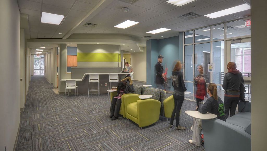 The campus aesthetic is traditional, neo-classical, with an emphasis on brick material. 2WR followed the design principles spelled out by the campus but strove to make the building unique while also meeting the extremely stringent and tight budget. 2WR chose subtle differences in brick patterning and color to create rhythms across the facade. Attached to those brick differences are subtle changes in plane that enhance the vertical rhythms created by the color and patterning change. Cast stone courses create horizontal ribbons around the building. The main entries of the two buildings are dichotomous in nature. The nursing building protrudes from the main building and incorporates heavy cast stone columns that harken back to the rest of campus. The sociology / psychology entry is recessed and incorporates a unique curtain wall that allows it to feel delicate and light.