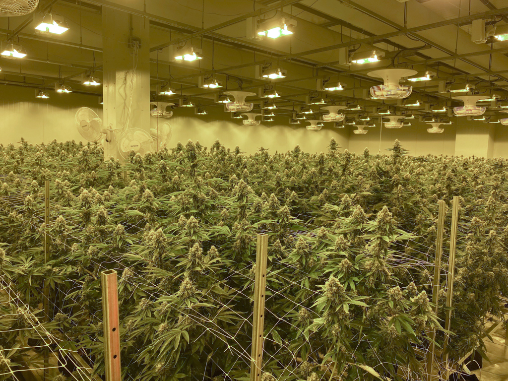 Cultivation includes single-tier benching in mother, veg, and flower. Propagation is 3-tier. The mechanical system is gas-fired chillers with ground mounted air-handling